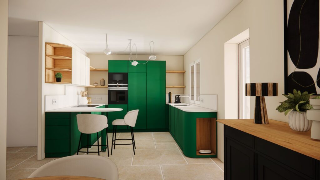 L’ambiance est à l’image du couple : authentique, naturelle, et chaleureuse. Leur univers a guidé mes choix vers une palette de vert vif associé à un terracotta tendre, réchauffée par le bois et ponctuée de touches minérales comme le plan de travail en céramique et le sol en carrelage (volonté des clients). Le résultat est un intérieur lumineux, où authenticité et modernité dialoguent. Pensé pour la vie à deux, ce rez-de-chaussée est aussi devenu un lieu de partage, prêt à accueillir enfants et petits-enfants dans une atmosphère conviviale et harmonieuse.