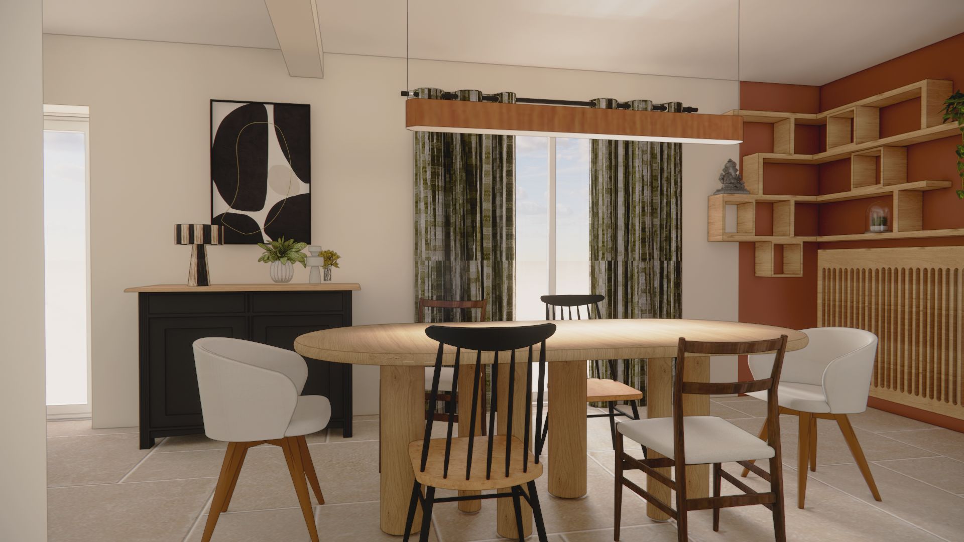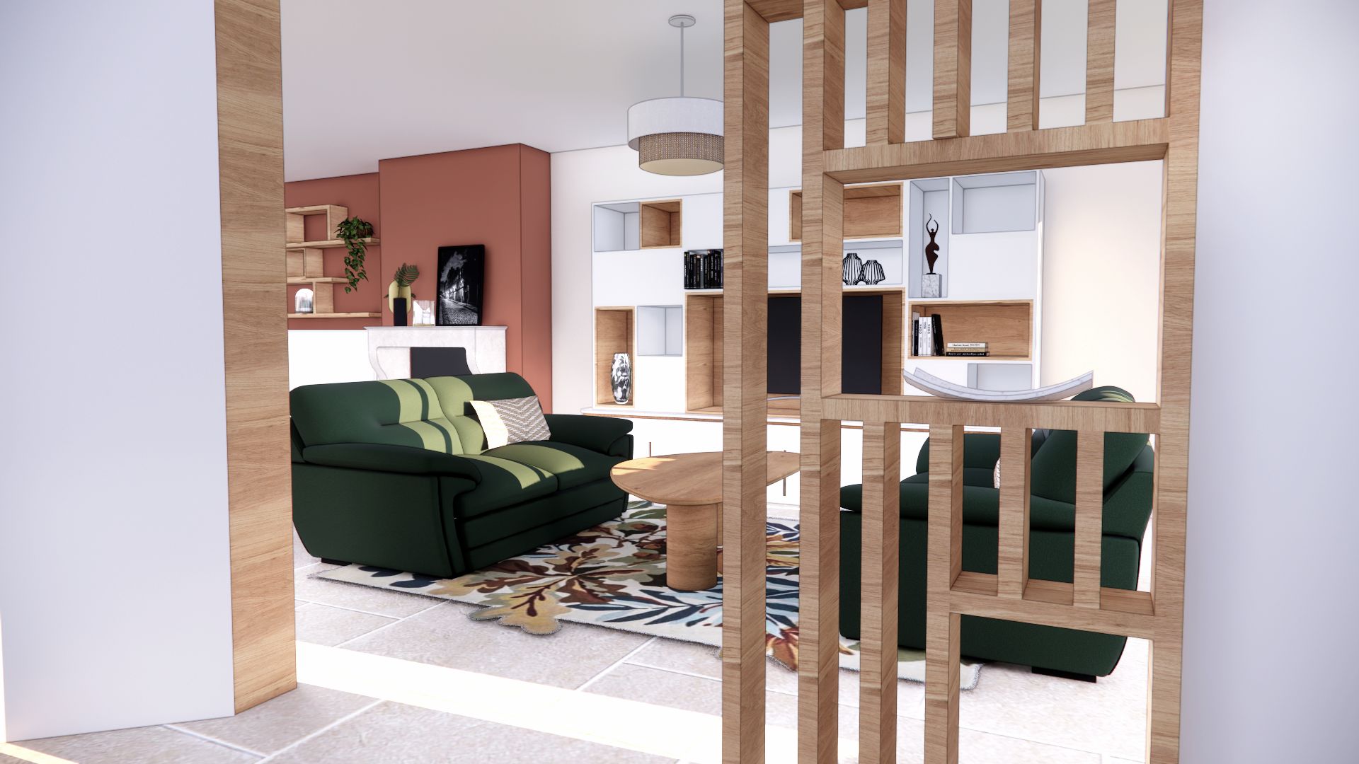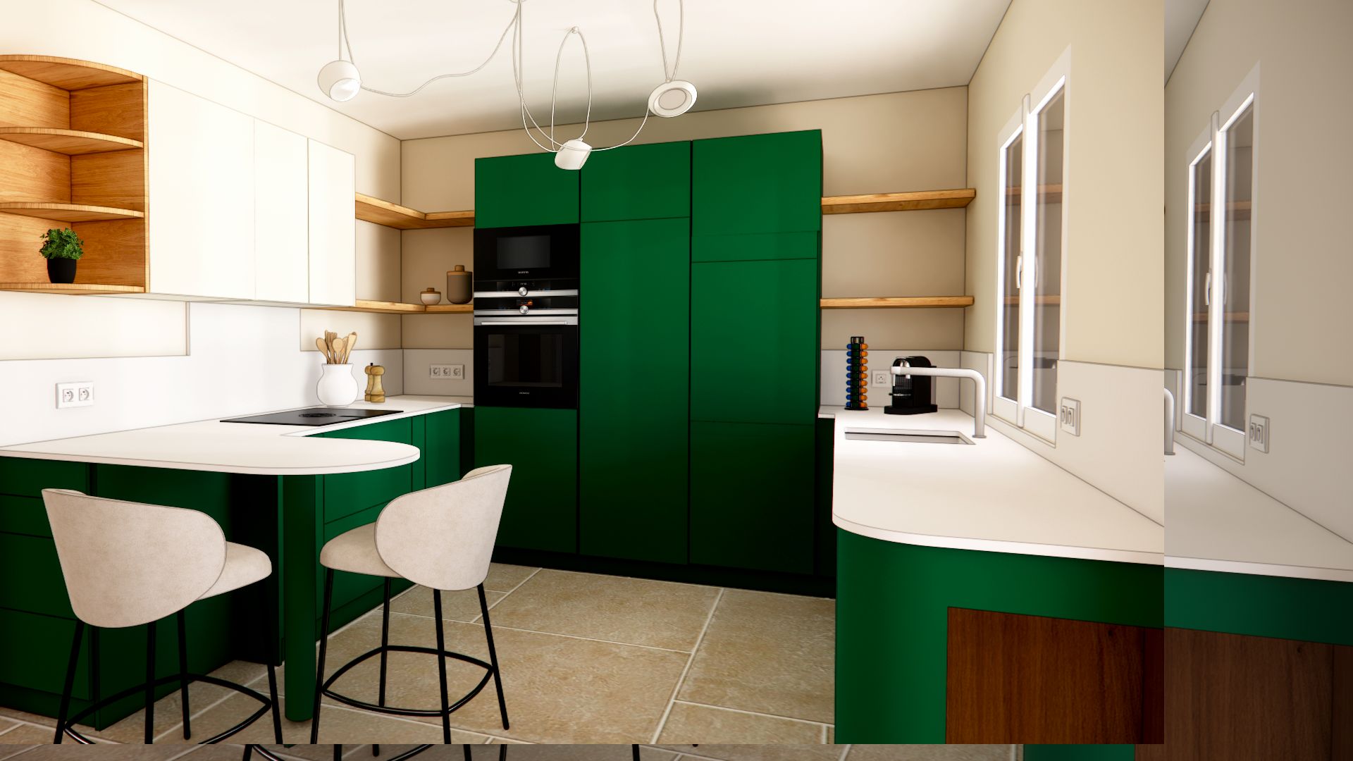 L’ambiance est à l’image du couple : authentique, naturelle, et chaleureuse. Leur univers a guidé mes choix vers une palette de vert vif associé à un terracotta tendre, réchauffée par le bois et ponctuée de touches minérales comme le plan de travail en céramique et le sol en carrelage (volonté des clients). Le résultat est un intérieur lumineux, où authenticité et modernité dialoguent. Pensé pour la vie à deux, ce rez-de-chaussée est aussi devenu un lieu de partage, prêt à accueillir enfants et petits-enfants dans une atmosphère conviviale et harmonieuse.