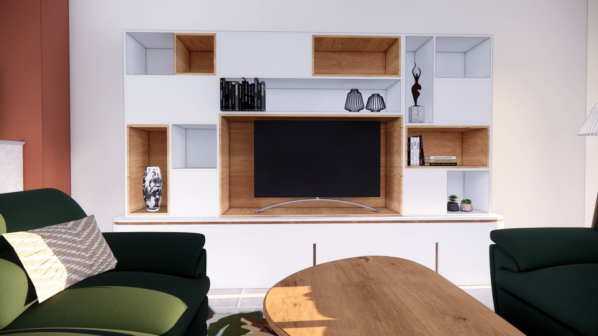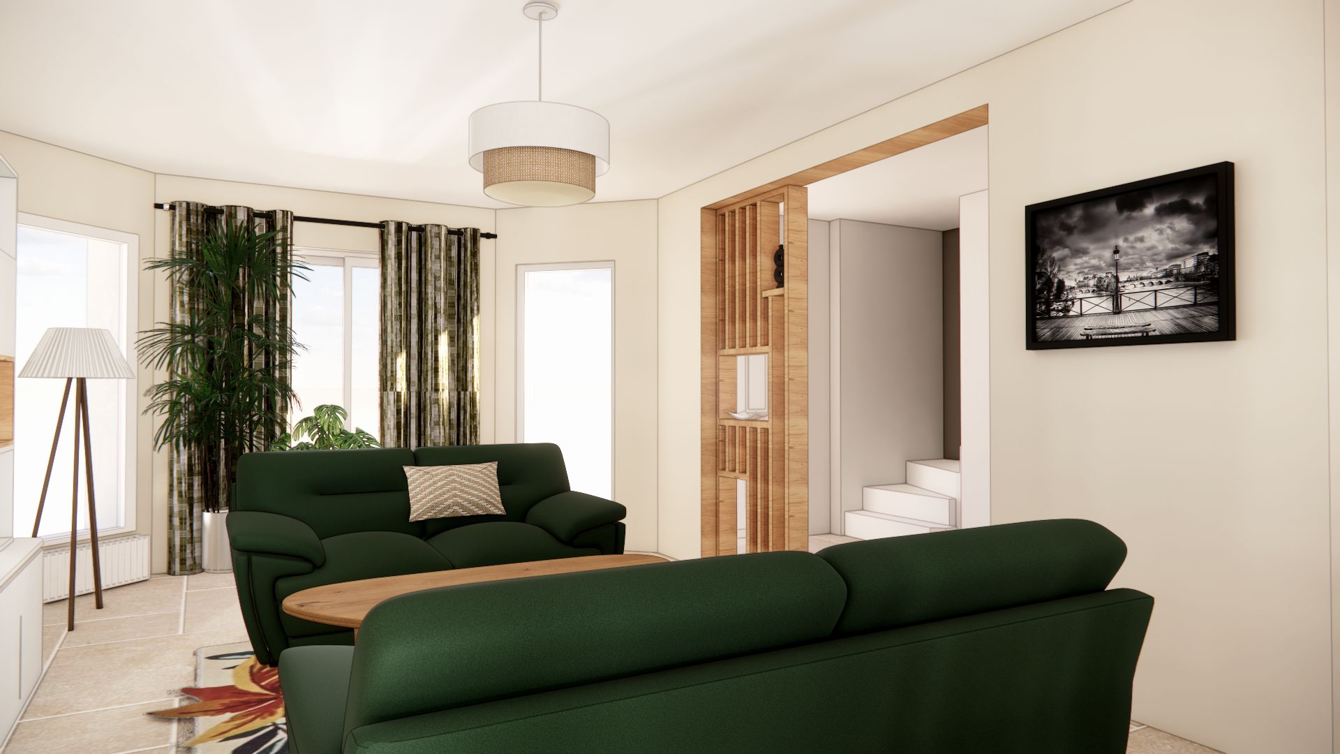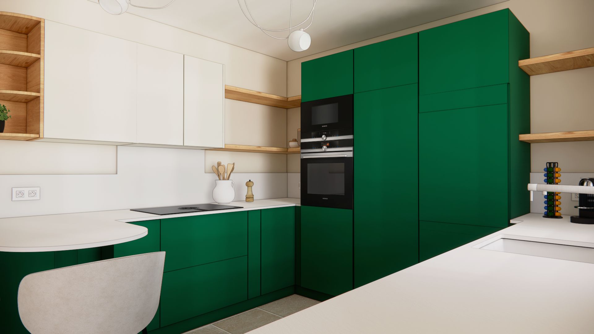 L’ambiance est à l’image du couple : authentique, naturelle, et chaleureuse. Leur univers a guidé mes choix vers une palette de vert vif associé à un terracotta tendre, réchauffée par le bois et ponctuée de touches minérales comme le plan de travail en céramique et le sol en carrelage (volonté des clients). Le résultat est un intérieur lumineux, où authenticité et modernité dialoguent. Pensé pour la vie à deux, ce rez-de-chaussée est aussi devenu un lieu de partage, prêt à accueillir enfants et petits-enfants dans une atmosphère conviviale et harmonieuse.