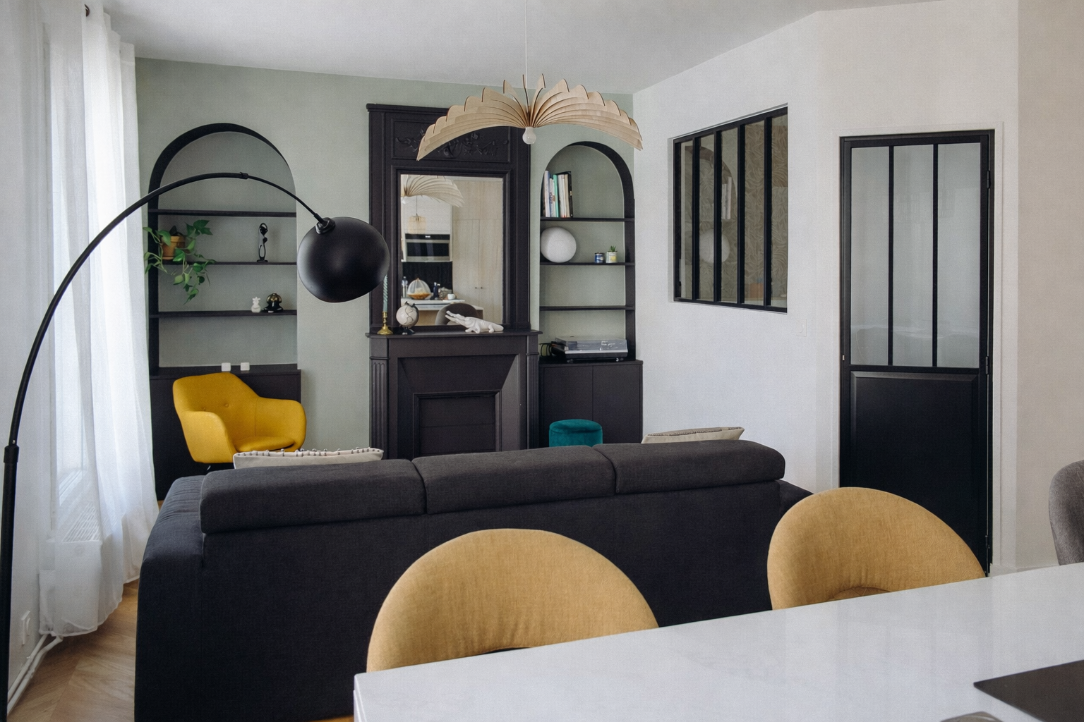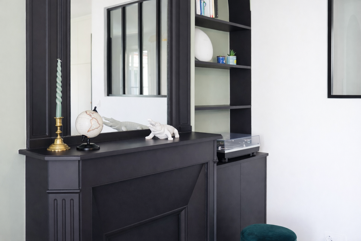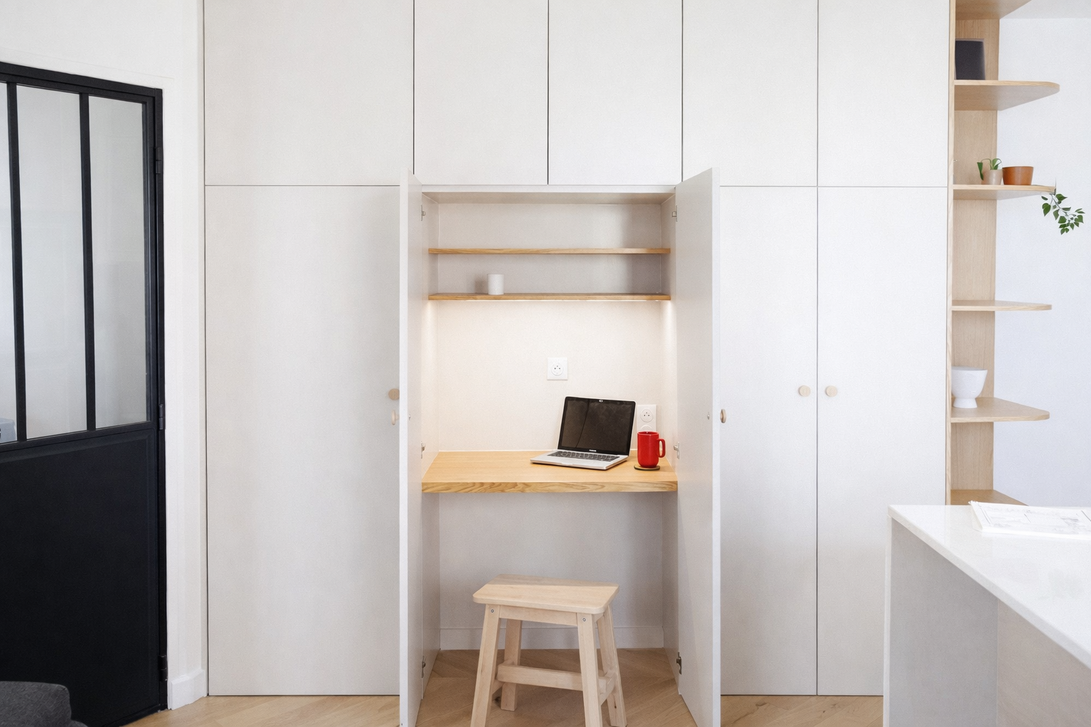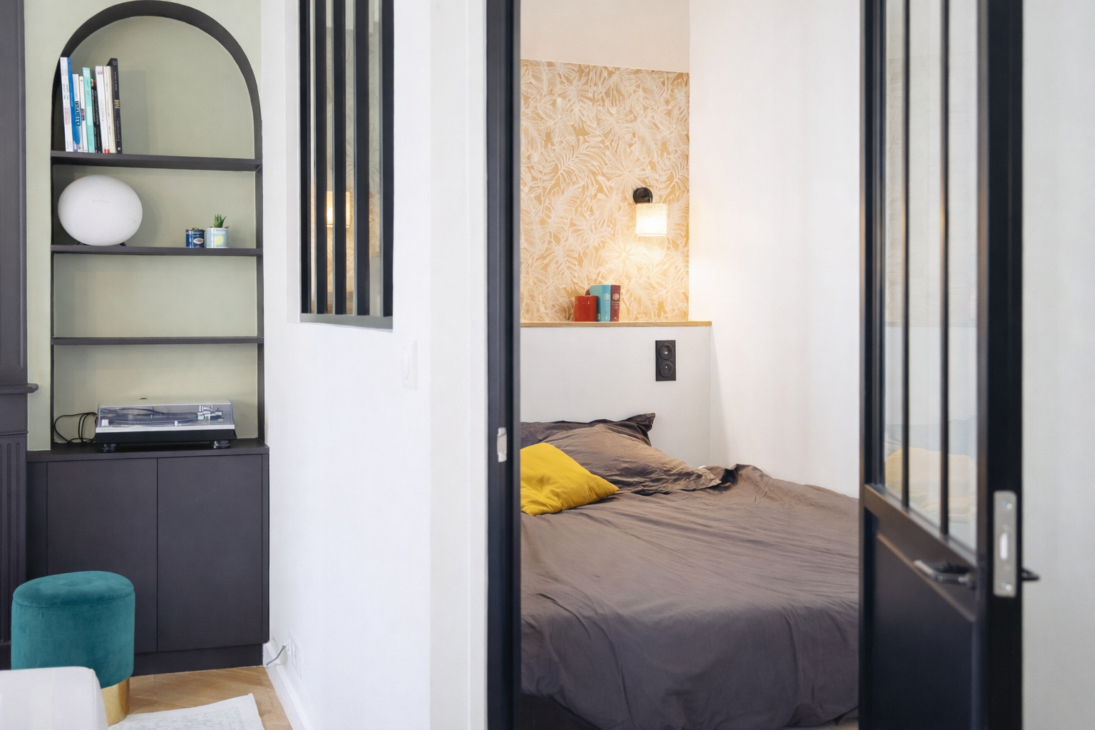 La chambre parentale a été délimitée par une cloison vitrée avec verrière et porte noire mate, façon atelier. Ce choix cloisonne sans assombrir et répond au besoin d’intimité. Un meuble sur mesure, toute hauteur, a été créé pour intégrer rangements et bureau, facilitant le télétravail et l’organisation quotidienne.