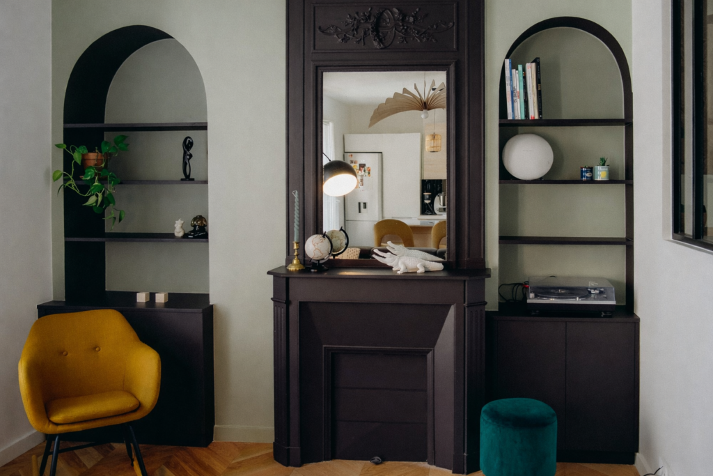Les anciens placards ont laissé place à deux meubles noirs sur mesure qui abritent les équipements techniques et se détachent sur un mur vert, pensé comme repère visuel. Enfin, l’isolation des murs en matériaux biosourcés a amélioré confort thermique et acoustique, tout en garantissant une bonne qualité de l’air.