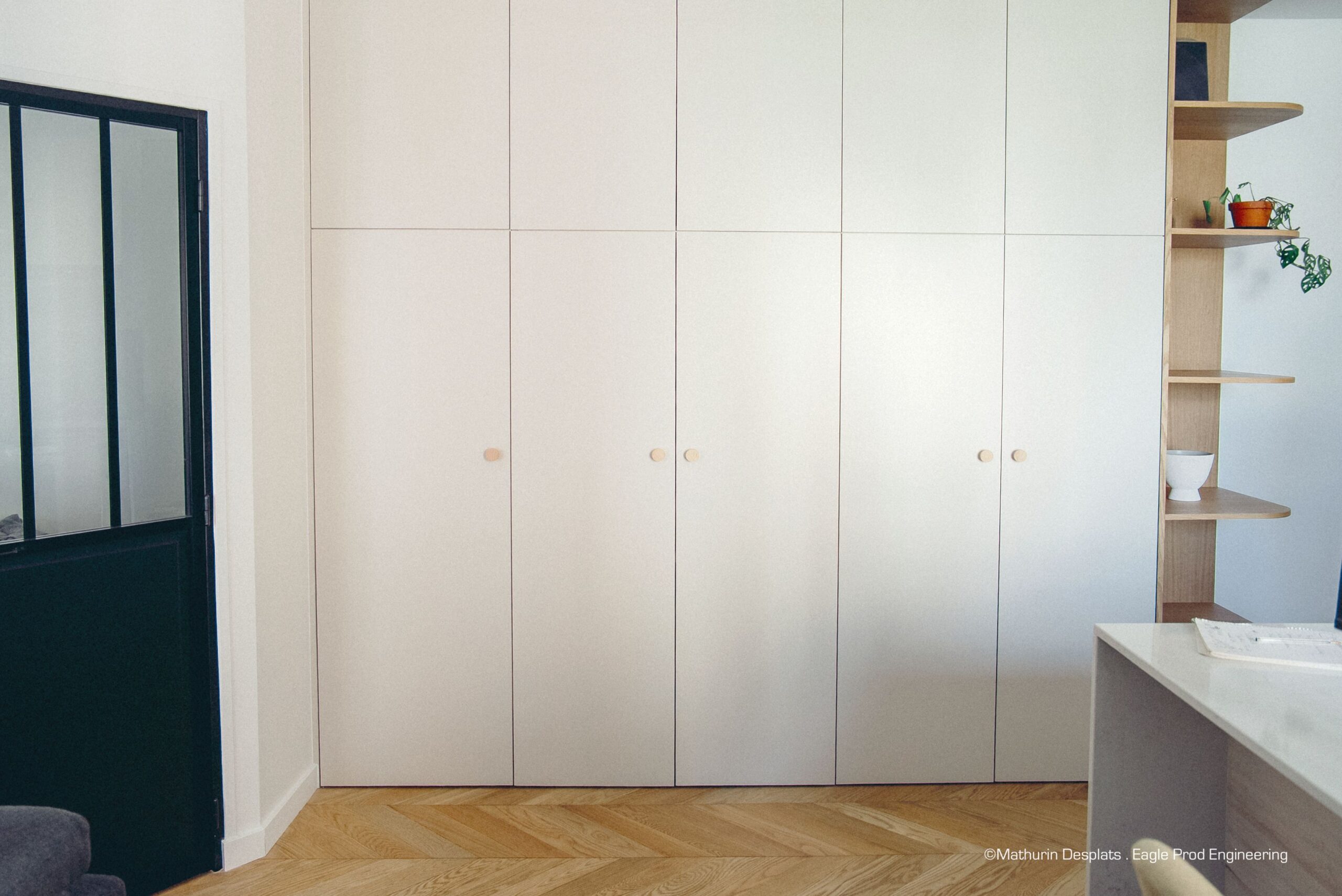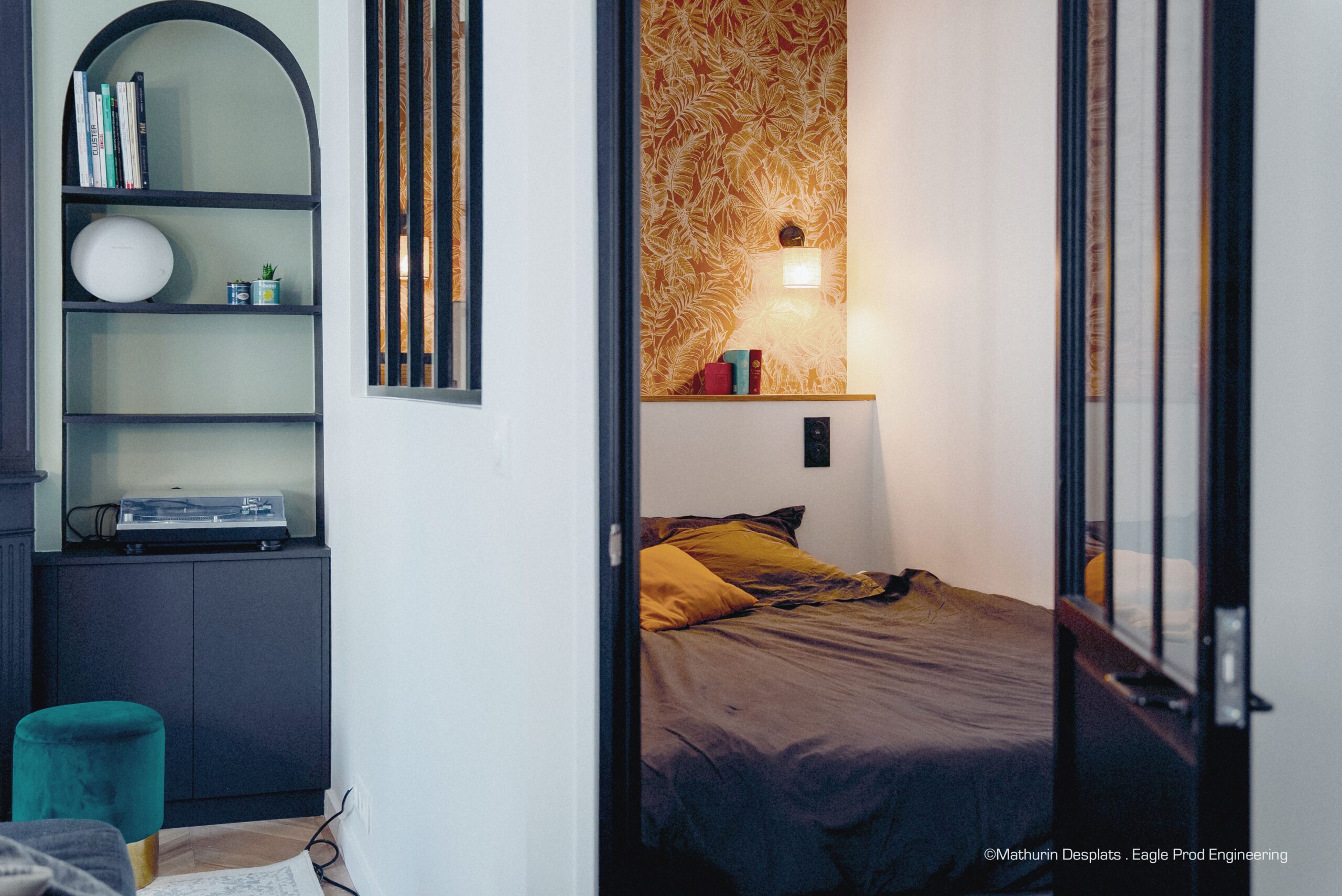 La chambre parentale a été délimitée par une cloison vitrée avec verrière et porte noire mate, façon atelier. Ce choix cloisonne sans assombrir et répond au besoin d’intimité. Un meuble sur mesure, toute hauteur, a été créé pour intégrer rangements et bureau, facilitant le télétravail et l’organisation quotidienne.