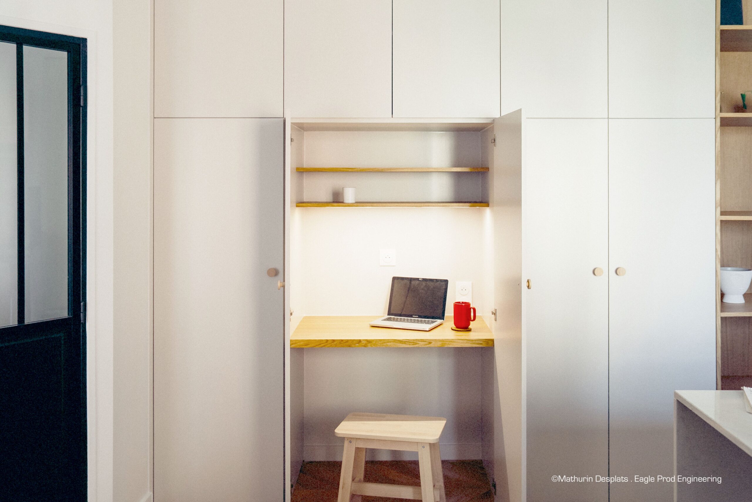 Leur besoin : un espace nuit fermé, un coin télétravail et des rangements. Ma mission a été de concevoir un projet sur mesure via un dossier de conception, en préservant la lumière naturelle, la circulation et l’optimisation des rangements. Souhaitant réaliser eux-mêmes les travaux, je les ai accompagnés et orientés vers des partenaires de confiance.