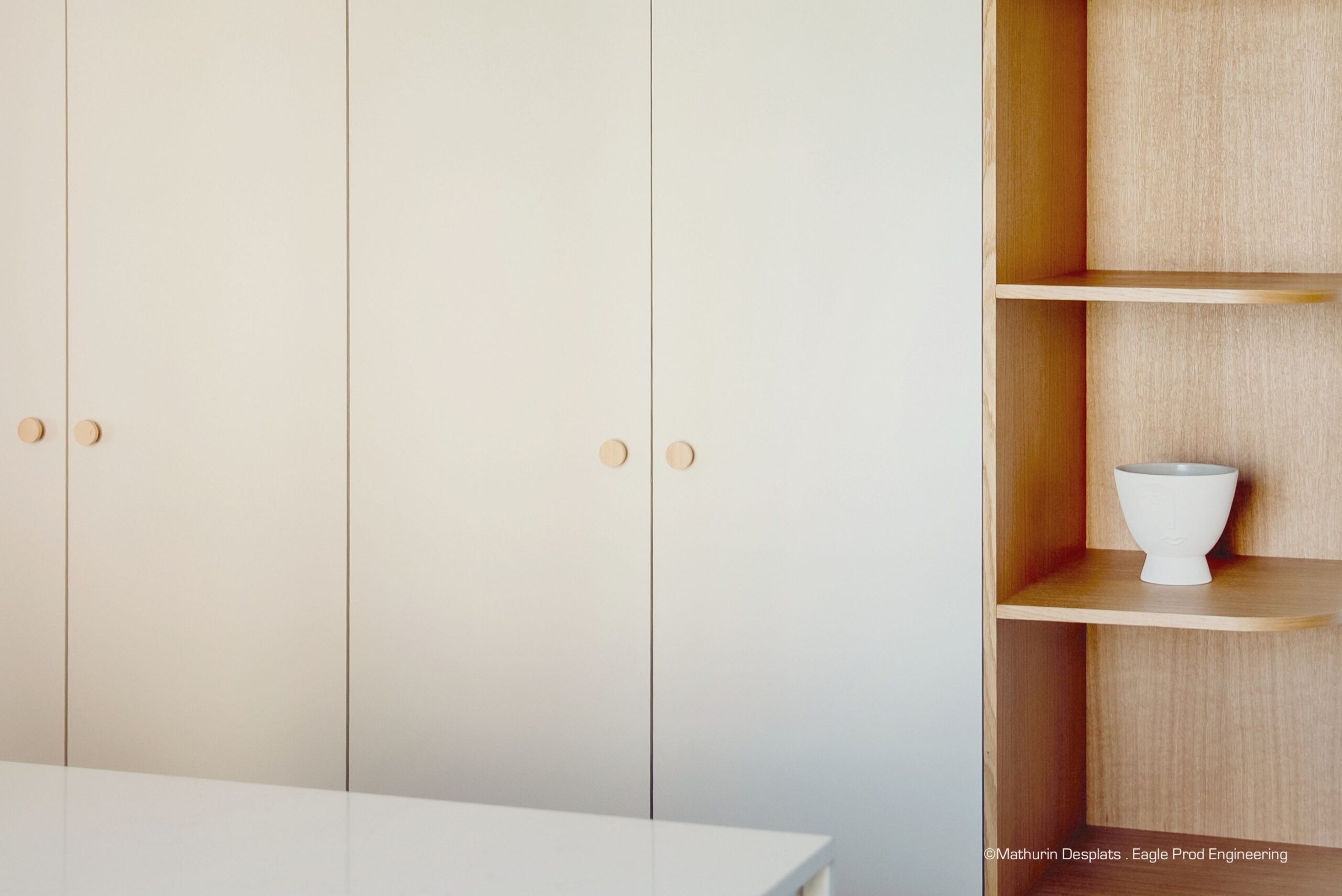 Les anciens placards ont laissé place à deux meubles noirs sur mesure qui abritent les équipements techniques et se détachent sur un mur vert, pensé comme repère visuel. Enfin, l’isolation des murs en matériaux biosourcés a amélioré confort thermique et acoustique, tout en garantissant une bonne qualité de l’air.
